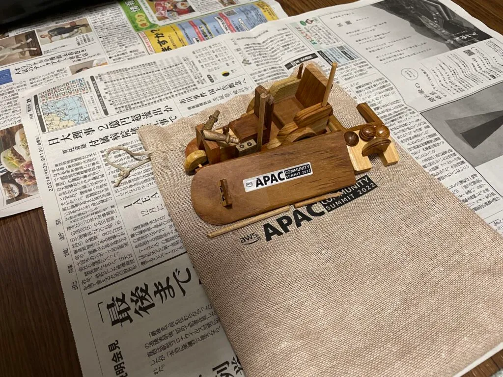 先に書いた AWS APAC Community Summit 2022 はタイで行なわれたのですが、参加者特典としてトゥクトゥクの木のオモチャをいただきました。