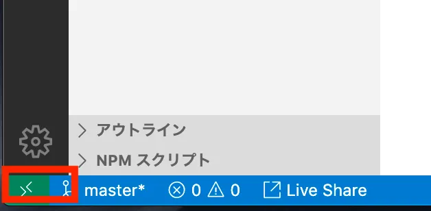 VSCode の左下 >< をクリックします。すると、メニューが開くので、Reopen in Container をクリックします。
