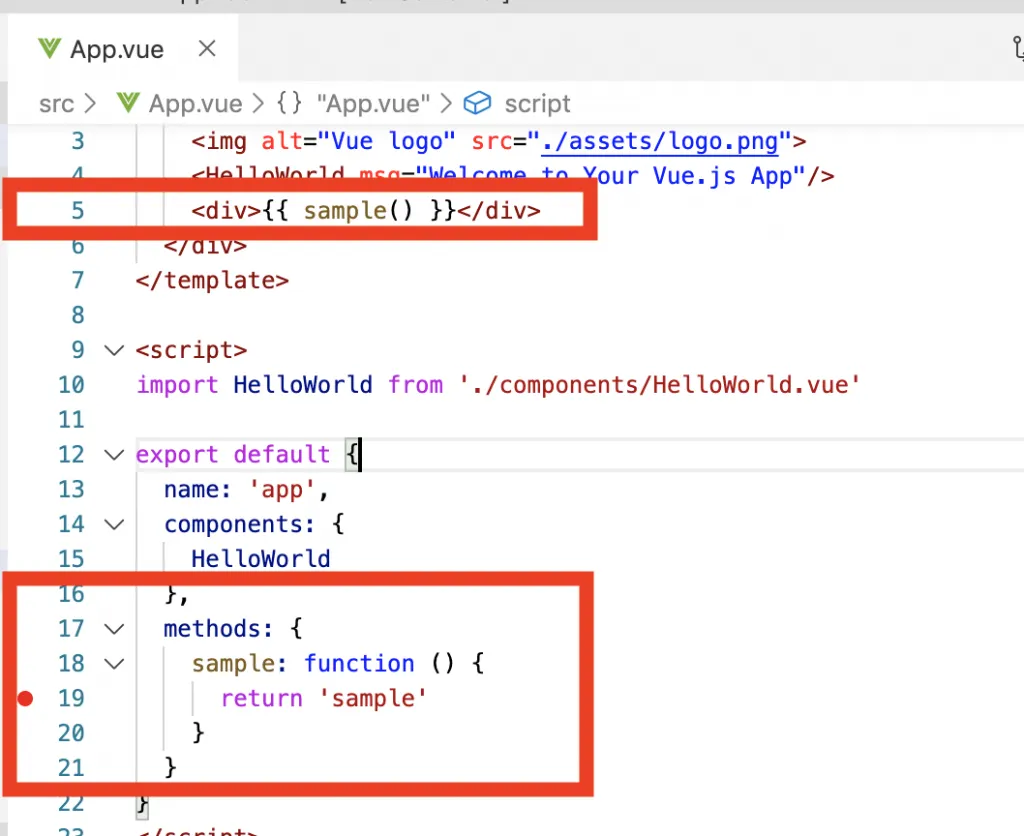 17行目-21行目に methods ブロックを追加し、そのブロックに追加したメソッドを5行目で呼び出しています。