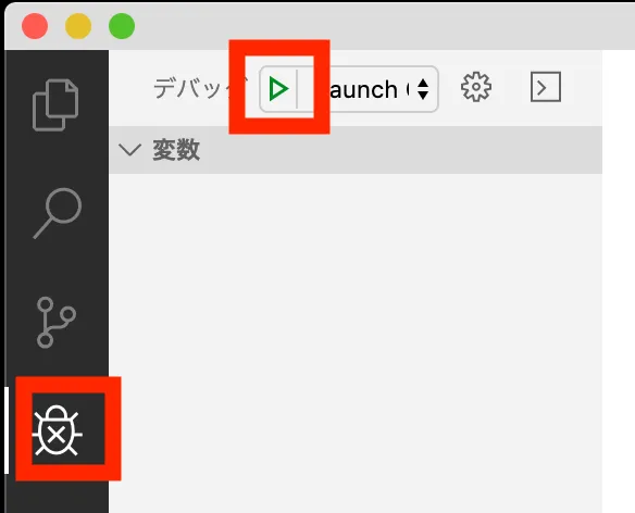 デバッガのタブを開き、緑の再生ボタンをクリックします。