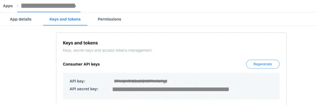 まずは、ここで Consumer API keys の API key と API secret key を確認。