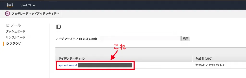 Cognito > IDプールの管理 > Amplify のプロジェクトで作成された IDプール > IDブラウザ